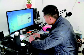 万贺在网上跟客户交流。