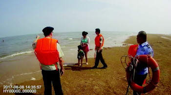 8月8日下午两点左右,黄岛公安分局灵海边防派出所民警接到报警,在黄岛区城市阳台南侧风河入海口处,有几名游客被困在礁石上,需要帮助。民警杨晓龙等人迅速赶到现场,被困在礁石上的是一家三口,两个大人,一个孩子,当时正是涨潮期,他们不熟悉潮汐情况,也不了解地形,站在礁石上不敢乱动。见此情形,民警指引他们从浅水区快速上岸,脱离了危险。经了解,遇险的杜先生一家来自吉林,看到海边风景很好,就下海戏水,到礁石上玩,没想到涨潮速度很快,等他们意识到的时候已经被困在礁石上。