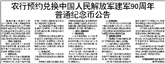 根据中国人民银行公告[2017]第9号,中国人民解放军建军90周年普通纪念币(以下简称建军币)在山东省(不含青岛)的预约兑换由中国农业银行山东省(不含青岛)内分支机构代理。建军币面值10元,预约兑换额度1540万枚。现将有关事项公告如下: