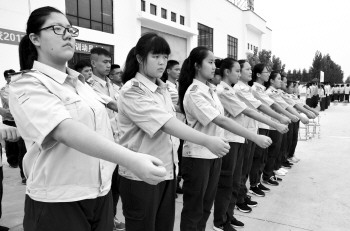 23日上午,曲阜市崇德学校的200余名新生集中到学校报到。当日下午,学校举行了新生军训动员大会,在为期一周的军训中,学生们将在教官的带领下进行站姿、队列等训练,以更饱满的精神状态迎接新学期。 本报记者 姬生辉 见习记者 谢丽聃 摄