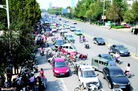 开学后,不少学校门前又出现拥堵现象。9月6日上午10时30分左右,在天衢东路小学门口,电动车、三轮车以及私家车扎堆,占满了三个机动车道,现场秩序十分混乱,交通堵塞严重。
