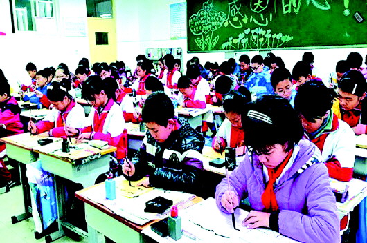 学生全神贯注练习毛笔字