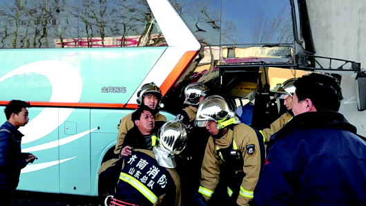 本报1月5日讯(记者 尉伟 通讯员 徐文昊) 5日中午,省城工业北路小辛庄附近上演惊险一幕:一辆外地大客车行驶中突然失控撞上了高架桥的桥墩,导致车头严重变形,车内多名乘客被困。接警后,济南公安消防支队黄台中队的官兵迅速赶赴现场救援,成功将被困的28人救出。值得一提的是,三辆路过的出租车也加入救援的行列,变身120急救车帮着运送伤员。