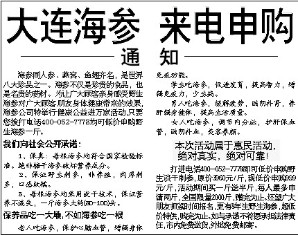 打进电话400-052-7778即可低价申购野生淡干刺参,原价3960元/斤,现低价申购999元/斤,活动期间买一斤送半斤,每人最多申请两斤,全国限量2000斤,赠完为止。还望广大朋友抓紧时间报名,更有8年生野生海参,超低价特供,购完为止。如与承诺不符愿承担法律责任,市内免费送货,外地免费邮寄。