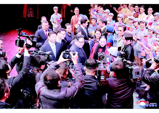 16日的演出结束后,在全场观众的热烈掌声中,金正恩和李雪主上台同演职人员握手,对艺术家们的出色表现给予高度评价,并与大家合影留念。