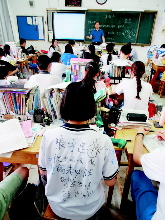 6月4日上午,济南山师附中高三学生的最后一节课,一名学生身着写满祝福语的T恤。 本报记者 周青先 摄