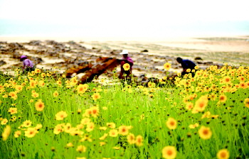 6月4日,在石岛管理区东楮岛村的乡村公路两旁,车辆在金菊花丛和楮树中穿梭。金黄灿烂的金菊花与大海、沙滩、风车、楮树、游人和晒海带的劳动者相映成趣,构成国家级历史文化名村、中国最美乡村东楮岛的独特风光。