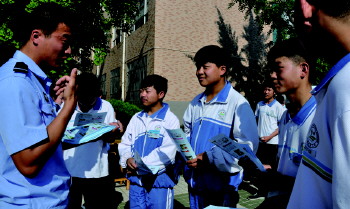 高考防骗宣传 高考临近,为增强学生的防骗意识,近日,沂源二中与沂源县公安局南麻派出所联合举办了高考防骗宣传活动。 (张吉爱)