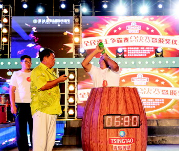 25日晚,第28届青岛国际啤酒节全民酒王争霸赛决赛在金沙滩啤酒城精彩上演,15位从酒王周赛中脱颖而出的选手同台竞技,向“酒王王座”发起冲击。经过激烈PK,已经是七届酒王的任光超成功卫冕,获得5万元现金大奖。