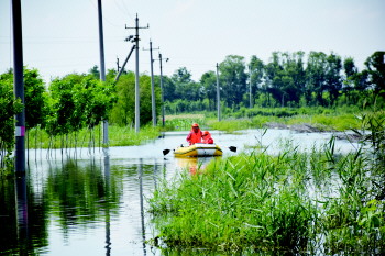 员工划船去井场对高压变电器进行停电处理。