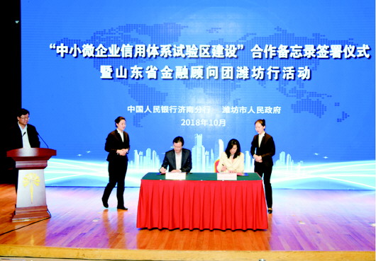 本报济南10月30日讯(记者 张頔)为推进区域金融生态文明建设、打造信用城市建设标杆、支持中小微企业发展,10月16日,人民银行济南分行与潍坊市人民政府在潍坊市联合举办“中小微企业信用体系试验区建设”合作备忘录签署仪式暨山东省金融顾问团潍坊行活动。