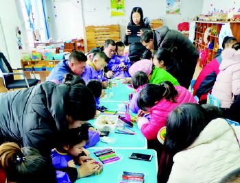 家园共育 为促进家长和学校之间的交流,实现家校教育合力,确保孩子健康快乐成长,近日,沂源县燕崖镇中心幼儿园举行了家长开放日活动。(张霞)