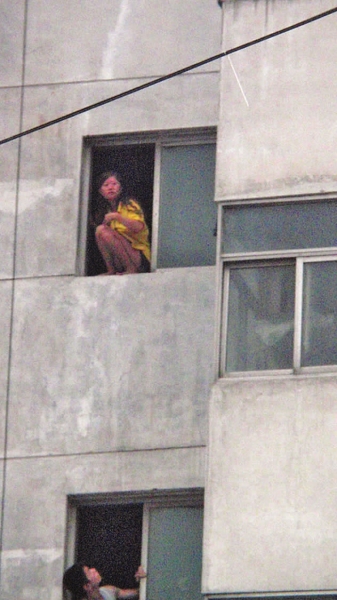 欲轻生女子坐在窗台上,不肯下来。 本报记者 陈洋洋 摄