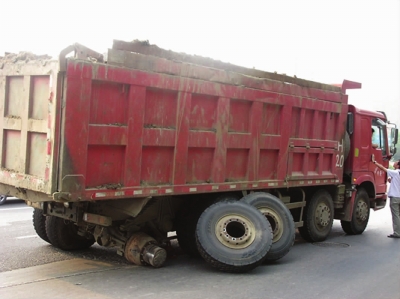 27日下午4时许,在福宁园附近的福州北路上,一辆拉土石方的大货车后排的两个轮胎突然飞向路边,记者赶到现场时发现,这辆斯太尔正装着满满的土石方,后排右侧车轮轮轴被生生的压断,现场留下近十米轮毂摩擦路面的擦痕。