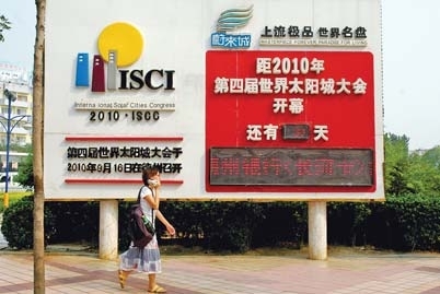 8月17日,市民从德州火车站广场上的太阳城大会倒计时牌前走过。距第四届世界太阳城大会召开还有30天。