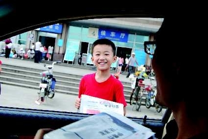 18日早8时,几名小选手在火车站向旅客卖报。图为一名卖报小选手成功售出一份报纸后,一脸喜悦。记者张涛周广聪摄