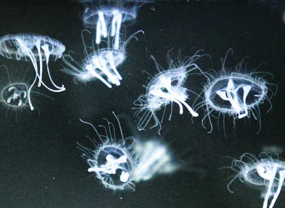 19日,记者在这几位摄影爱好者的办公室见到了他们用玻璃鱼缸采集的生物样本。这些生物直径约2厘米左右,在水中形态多变,晶莹透亮,柔软如绸,悠然自得,长着五个呈桃花形分布的触角状物体,游动起来就像飘落水中的桃花在表演“花样游泳”。