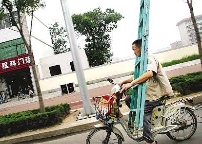 18日,德州一骑电动车的市民戴着一副长梯在三八路上前行,不禁让人们为他捏了一把汗。