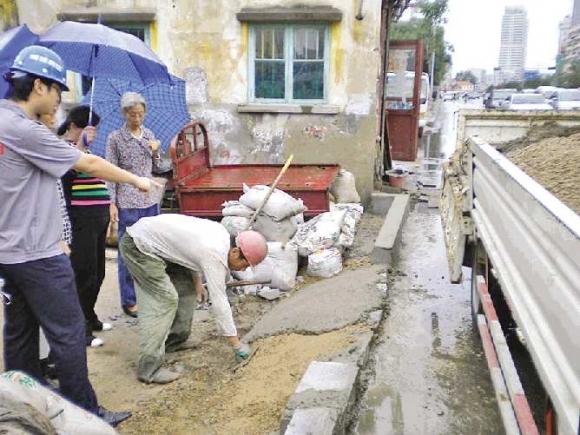 确定了施工方案后,烟建第十公司的工作人员立刻赶回工地拉材料。20来分钟后,万明罡和两位建筑工人带着半车沙子、水泥和加气块来到了小新街,几位老居民见此情况,笑得合不拢嘴,一个劲握着记者的手说谢谢,热情地招呼烟建集团的工作人员先歇歇。兴隆街居委会的工作人员也冒雨赶到小新街帮忙。
