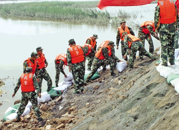27日,沾化县黄升乡潘家闸险工段,武警官兵用沙包筑起一道新的大堤。随着两次强降雨侵袭鲁北地区,处于山东境内的徒骇河河水从上游迅猛而下,直逼下游的滨州,河水迅速上涨到历史最高。为保护群众生命财产安全,武警山东总队直属支队和滨州武警支队顶住了洪峰的多次冲击。 潘明 忱远 王进军 摄影报道