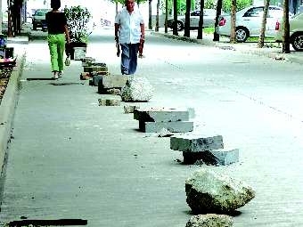 9月2日,记者来到这条道路,被眼前的景象惊呆:从建设路与这条道路交叉处开始,一块块石头摆在马路中间靠右的位置,有的是大石块,有的是石墩,有的则是长石板,从路口一直延伸到道路的终点———山水家园小区门口。记者看到这条道路宽约5米、长近千米,峰景鉴筑小区和机床一厂宿舍位于路两侧。
