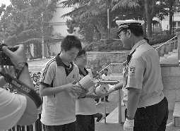 开学伊始,市北交警将交通安全宣传课纳人学生德育、法制教育的必修课中。7日上午,市北交警组织青岛九中1300余名学生,集体宣讲交通安全第一课。图为交警正在发放《德育文摘》。 通讯员 王友科记者赵壁摄影报道
