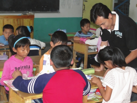 曹荣锋老师正在辅导孩子们上课