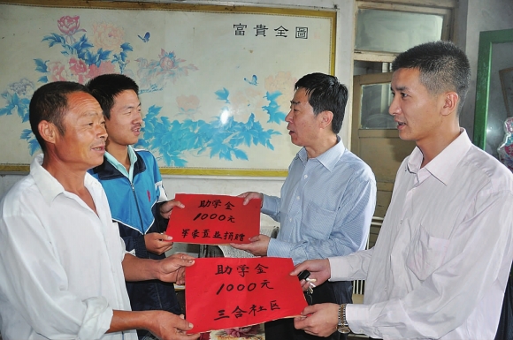 7日上午,泰安军豪置业有限公司相关领导及三合社区居委会工作人员,为社区应届大学新生刘华柏送去了2000元的助学金。据介绍,正值开学之际,泰安军豪置业投入专项慈善基金,与三合社区居委会联合开展了一次爱心助学活动。7日,三合社区共有4名应届大学新生拿到爱心助学金。通讯员 刘东 摄