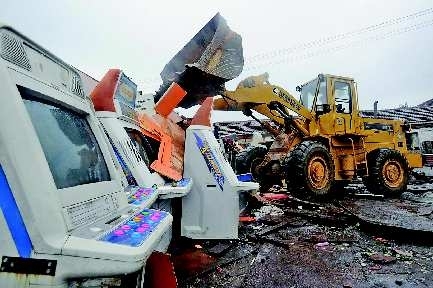 9日上午,温泉镇的—处废品回收站内,环翠警方将215台电子赌博机及数百支管制刀具、弓弩、仿真枪集中销毁。这些违禁物品是6月20日以来,环翠警方在涉赌专项整治及缉枪治爆行动中缴获的。