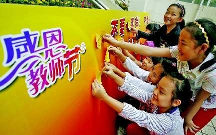 9日,山师附小雅居园校区,孩子们在留言板上给老师留节日祝福。该校开展了“不要—束鲜花,不要—份礼物,给您的老师留下—句祝福”的主题活动,留言板上是孩子和家长的句句祝福。 本报记者周青先摄