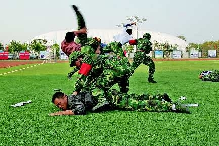 ▲12日,德州军分区民兵分队600余民兵在中国太阳谷太阳能体育场举行了安保演练。图为民兵巡逻队员在处置应急“情况”。本报见习记者王金强本报通讯员豆金伙摄