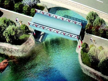 “通车后,这座升降桥也将成为长河公园内的—大亮点。当桥身降下时,桥身与两头的路面高度持平,出人公园的车辆可从桥面上驶过;等河道打通后,游船可从升起的桥面下顺利通过,经由长河公园世纪湖向东途经沙王河的董子读书台,最后到达减