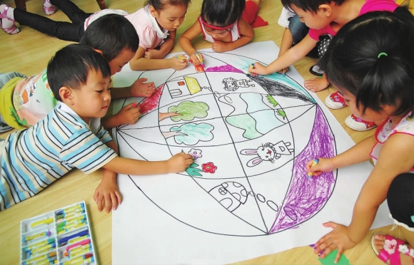 14日是世界清洁地球日。当日,泰山区财源街道中心幼儿园开展了“打扮地球妈妈”、“我为地球添色彩”等活动。图为小朋友们在地球图案上作画。