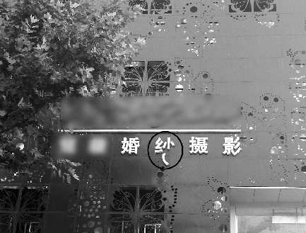 15日,新威路某路段上,—家婚纱店的店名中的“纱”字—撇掉落错位,字不成字。本报记者冯琳摄