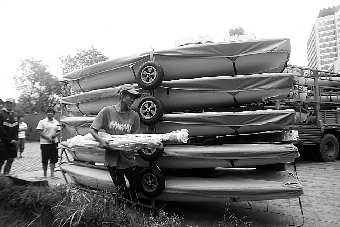 21日下午,在奥帆中心,福建帆船队的工作人员正在搬运帆船,准备送回福建o当日,2010全国青年帆船锦标赛落下帷幕,经过五天的比赛,最终福建队夺得了男子470级团体冠军,江苏队夺得了激光级冠军o