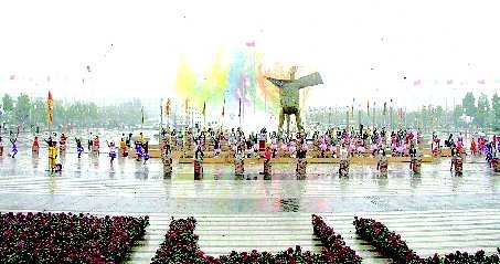 21日早上,在烟台国际博览中心广场,与会人员冒雨进行了一次开馆式预演。记者在广场看到,广场喷泉以北约3米处为8.8米高的酒樽主体造型,内置了60组银龙焰火,两侧还设置了30门彩炮和彩虹机,主体造型东西两侧还摆放了“旋舞盛世”的气模造型。主体造型下方表演舞台上88名盛装女子鼓手表演水鼓,寓意“鼓”舞盛世。水鼓表演节奏强烈,水花四溅,震撼全场,会场西侧吉祥物“甜甜”在迎风微笑,葡萄状的启动装置系上大红花缓缓开启,内藏的国际葡萄酒城城徽将展现在来宾面前,激昂的音乐全场响起,冷焰火升起,葡萄公主头戴皇冠、手持五角星公主棒欢快舞蹈。届时,两侧舞者还将上演京剧、现代舞蹈、风笛、踢踏舞等等,88个水鼓将变换成酒桶造型,呈现在来宾面前。