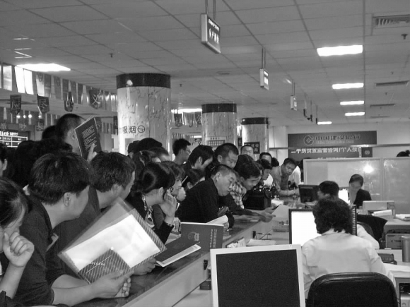 8日上午,威海市房地产交易大厅内办理房产证的人排成长队。工作人员表示,因为是国庆节后第一天上班,不少中介公司和市民在假期积攒的手续都赶在当天办理。