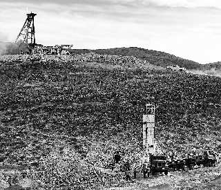 8月5日 智利首都圣地亚哥以北大约800公里的圣何塞铜矿塌方,33名矿工受困地下大约700米处。8日,救援人员开始钻凿一个直径12厘米的巷道,试图确定受困矿工所处位置。图为8月8日,在智利北部沙漠地带发生塌方事故的铜矿外,工人安置用于救援的重型机械。