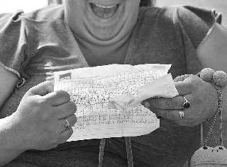 9月18日 被困矿工维克托·萨莫拉的妻子科尔特斯阅读丈夫从井下的来信时欣喜万分。被困矿工的救援工作9月17日取得突破性进展。智利政府证实,T■130型钻机当天打通了一条救援通道,朝救出33名矿工迈出了重要一步。