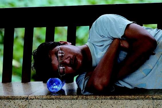 自述:在湖北宜昌某风景区,—位游客玩累了,索性在凉亭里枕着矿泉水瓶躺下了。