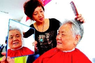 13日,泰前街道办事处科大社区的理发师义工正在给老人理发。义工们希望老人们在“九九”老人节剪个新发型过节。