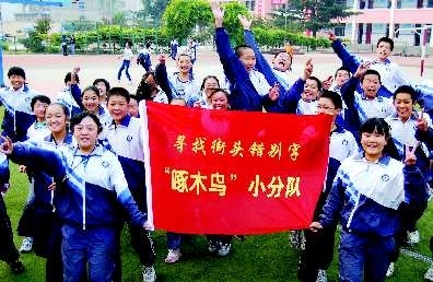 本报《街头错别字,市民犯迷糊》的报道在泰城市民中引起较大反响。14日,泰山实验中学、泰安市第—实验小学成立了由148名学生组成的寻找街头错别字“啄木鸟”小分队。这些“啄木鸟”们将走上街头,寻找街头巷尾的错别字。图为“啄木鸟”小分队成立现场。 本报记者刘丽 摄