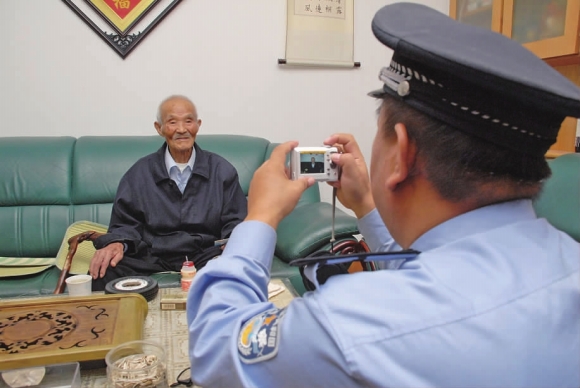 在市南区居住的60周岁的老人达到9万3千余人,占全市总人口的17.1%,这其中有不少老人因为身体原因,迟迟没有办理二代身份证。14日下午,记者跟随市南公安户籍科的民警来到家住浮山所的老人于存渊家,为他办理二代身份证。看着民警拿着相机给自己拍照片,已经100周岁的于存渊笑得格外灿烂。