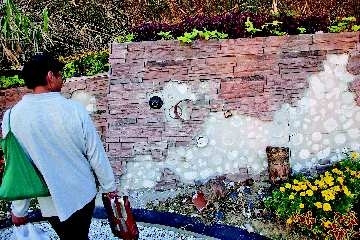 14日下午,—名游客在中山公园淄博园内的瓷器墙前走过。这面原本为2010省园博会精心装扮的精美瓷器墙,遭部分游客破坏后带走,只剩下坑坑洼洼的墙壁和残缺不全的瓷器残片。本报记者 张晓鹏 摄影报道