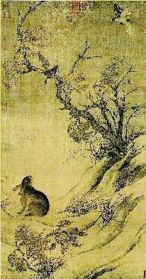 不知崔白从何处,得到这天趣瞬间———兔子和绶带鸟,一个向上看,一个朝下叫,一从容,一惊骇,对比映照,境界神来。