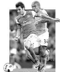 当地时间10月24日,阿森纳队球员法布雷加斯(左)与曼城队球员德容拼抢。当日,在2010—2011赛季英格兰足球超级联赛第9轮的比赛中,阿森纳队客场以3:0战胜曼城。 新华社 供图