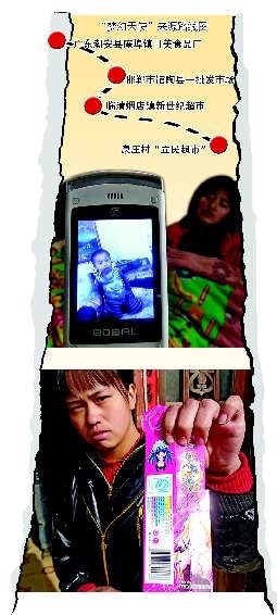 手机里的这名小男孩永远离开了亲人。这种叫“梦幻天使”的零食包装上印有QS标志。摄影/姬生辉 王尚磊