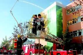 9日,东营市公安消防支队在东营区一中进行消防防火演练,消防队员正在通过云梯营救教学楼第3层被困的4名学生。消防人员接警后迅速到达现场,展开“不要跳楼 等待救援”的条幅,并进行火情侦查,展开救援。最后,被困人员被成功营救,并扑灭大火。