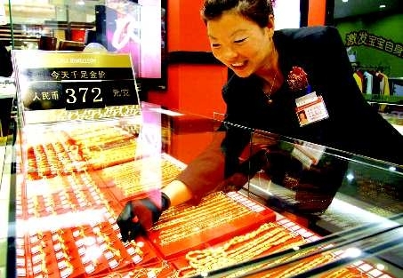 11月9日,在市区一家商场内,工作人员在整理黄金饰品。据了解,受国际金价持续走高的影响,黄金价格又创新高,每克最高达372元,较之前每克上涨15元左右。 记者 展萍 摄