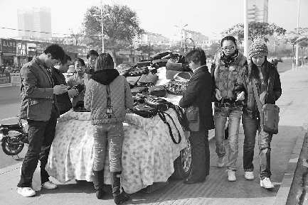 近日,在黄海—路北侧人行道上,—商贩把轿车停放在人行道上,搭成临时柜台销售皮包,引来不少人围观购买,却给步行的市民带来不便。 徐升 徐艳 摄